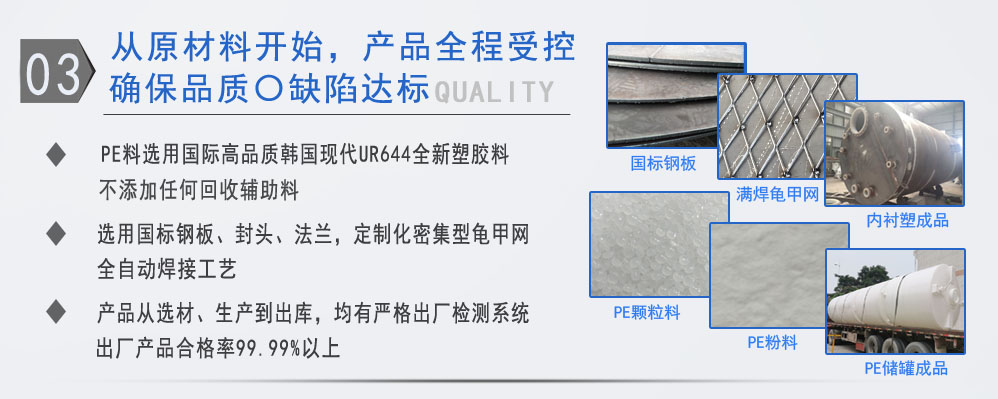 公司有鋼襯塑PE/PO、PE全塑、碳鋼、不銹鋼四大系列100多個品種,專注于常壓儲存容器生產,其產品包括鋼襯塑儲罐、管口一體成型PE儲罐、碳鋼儲罐、不銹鋼儲罐、反應釜、攪拌罐、離子交換柱、鋼襯PE/PO儲罐、塑料儲罐、鹽酸儲罐、硫酸儲罐等等。更大限度滿足廣大客戶的各種需求,同時可以根據客戶的需要加工定制各種防腐設備。